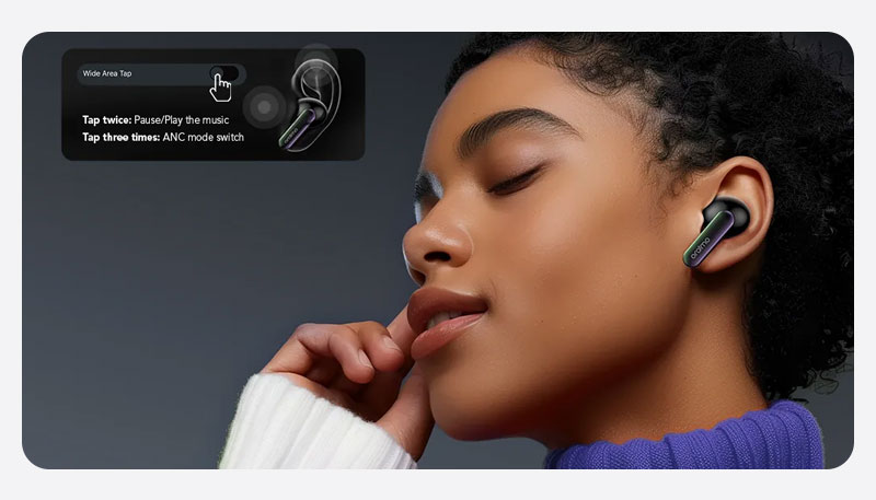 تحكم في الصوت باستخدام اللمس الواسع على الأذنين دون الحاجة إلى الاتصال المادي مع السماعات، مما يسمح بتحكم سهل في الموسيقى ووضع التشغيل.